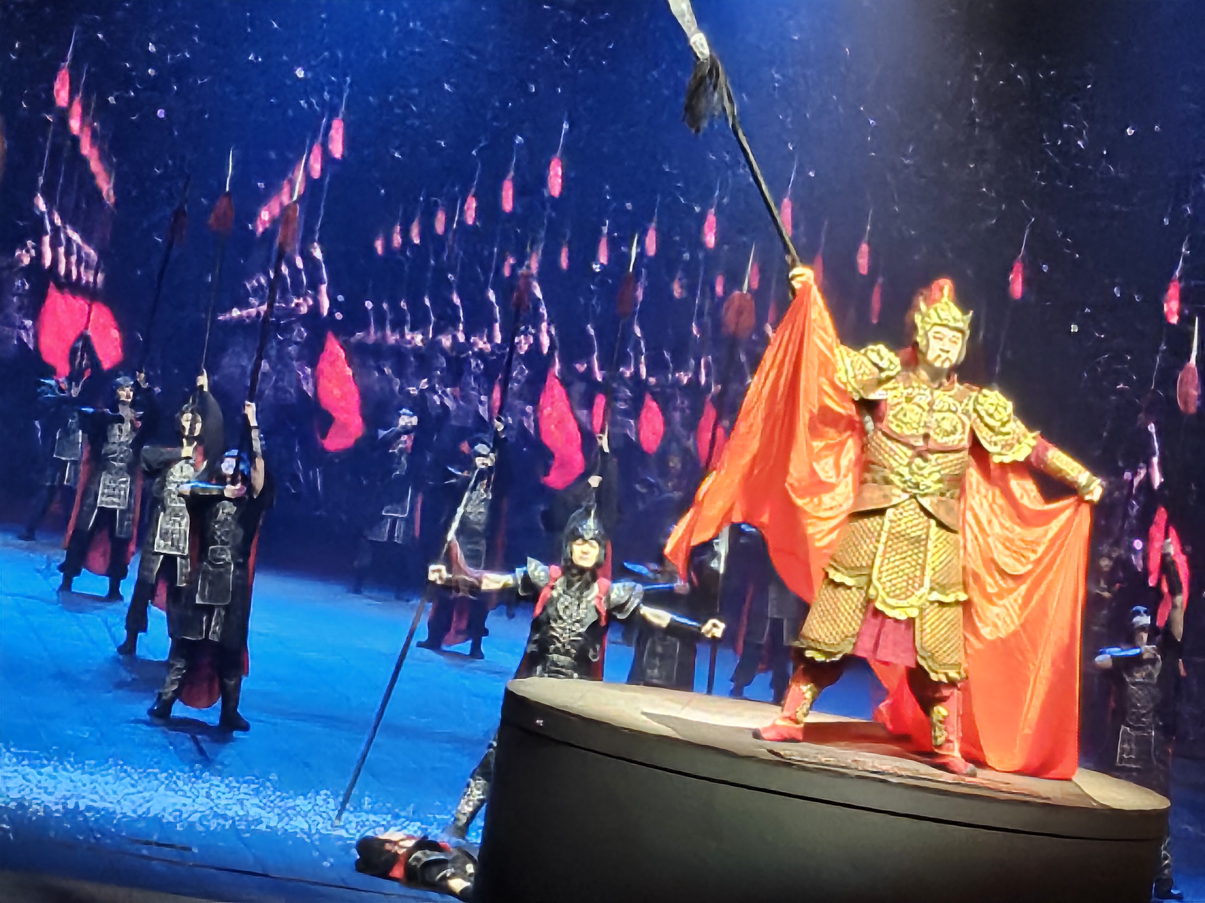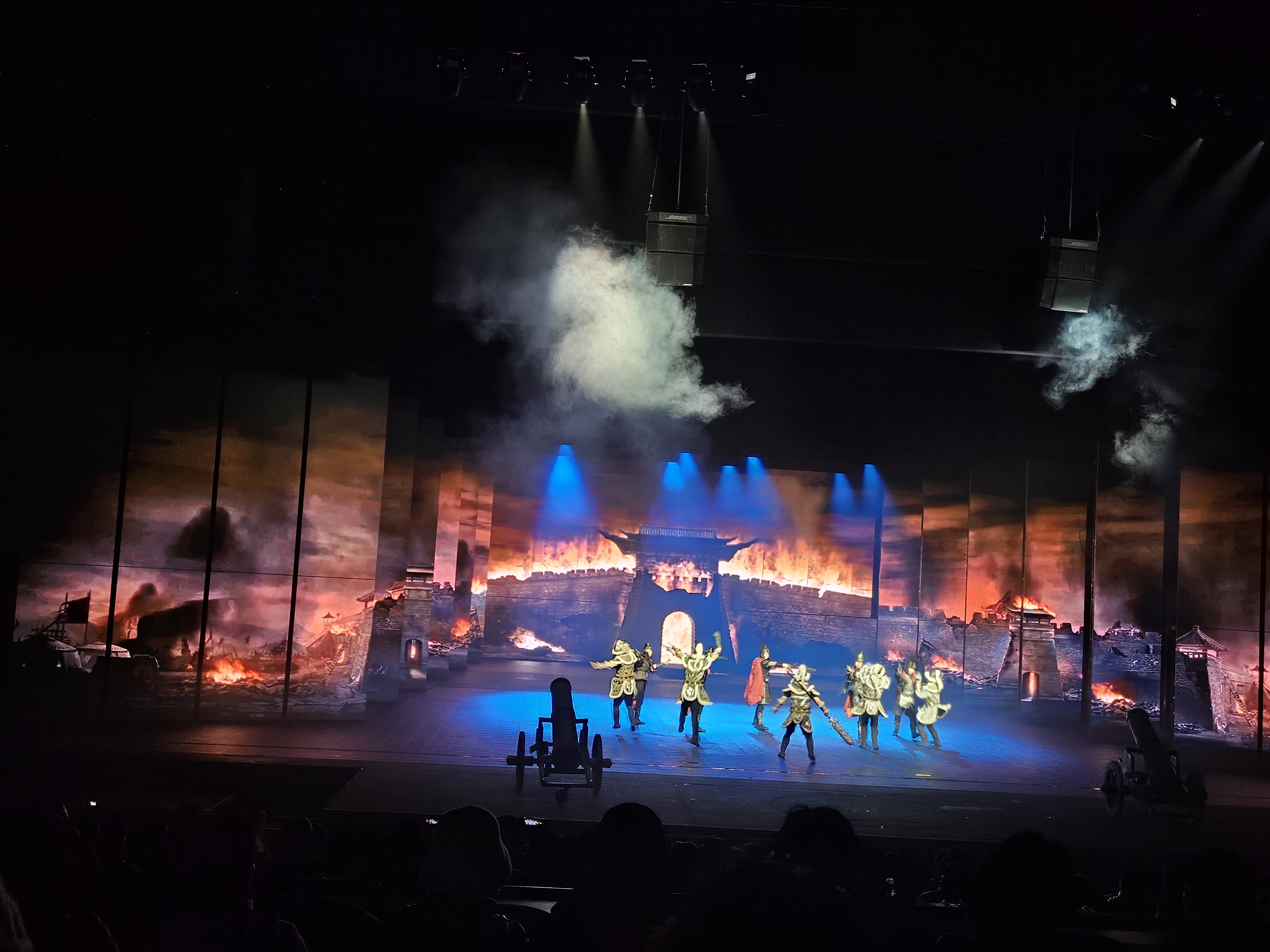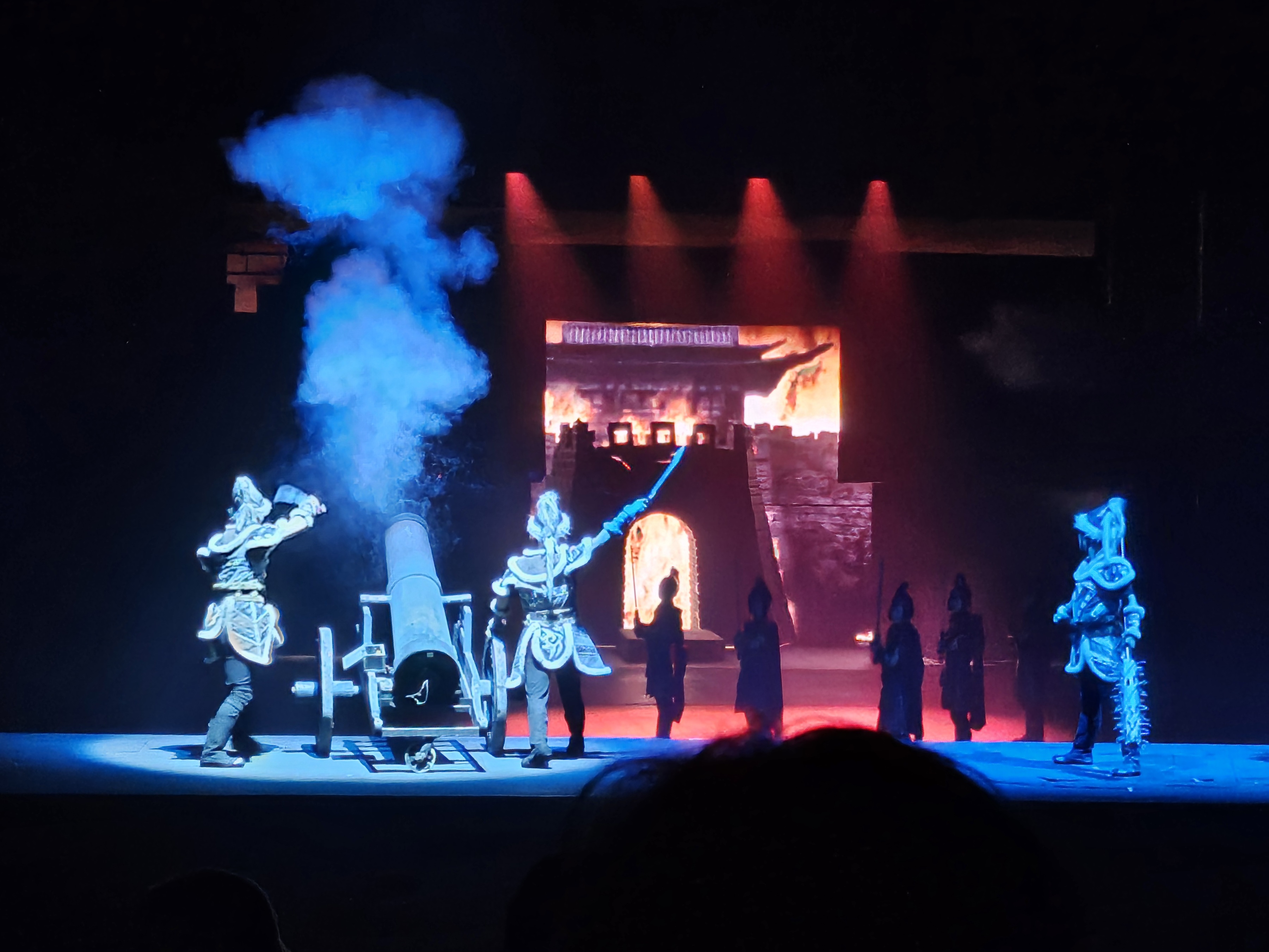 실제 말을 타고 등장하고 대포를 쏘며 하늘에서 비가 내려오고