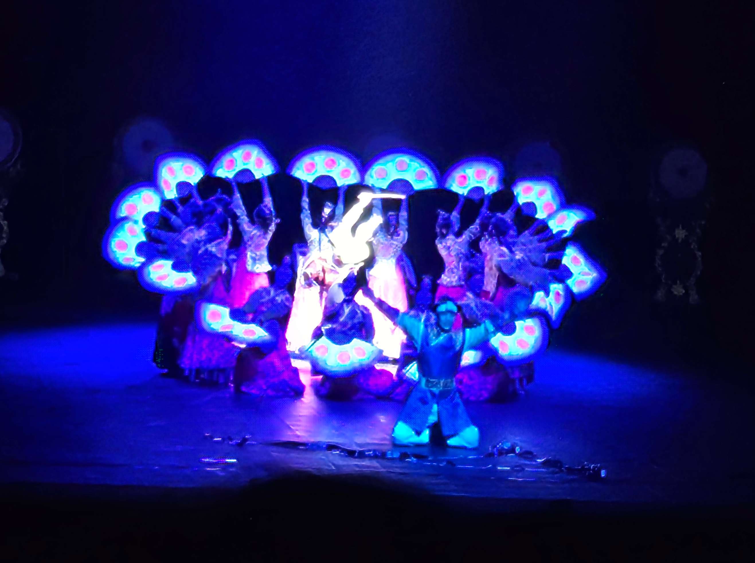 뇌봉탑과 백사의 전설에서는 무대 위에서 물이 쏟아지며 비가 오는 장면을 멋진 무대를 연출한다.